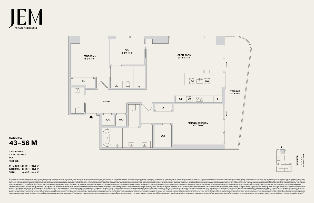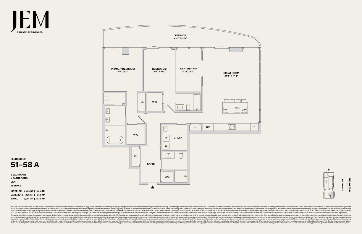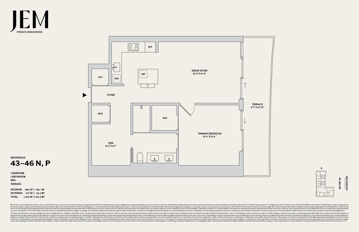 JEM Private Residences is a 67-story luxury condominium tower at 1016 NE 2nd Avenue (Miami Worldcenter), offering roughly 259–278 residences from studios to 3-bedrooms (plus penthouses), with wraparound terraces and skyline-bay views.